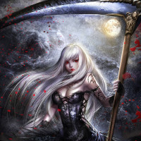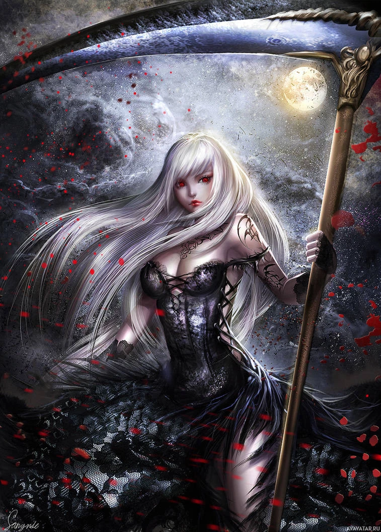 a dynamic pose, holding what appears to be a scythe with one hand and possibly another weapon or object in the other. She has a gothic style dress with intricate details and accessories that contribute to a fantasy-themed aesthetic. The background suggests