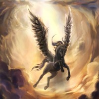 a fantastical scene where an angel, recognizable by its wings and halo, is riding a horse. The horse has the distinctive features of a pegasus, such as wings and a mane that stands upright like a plume. They are set against