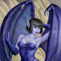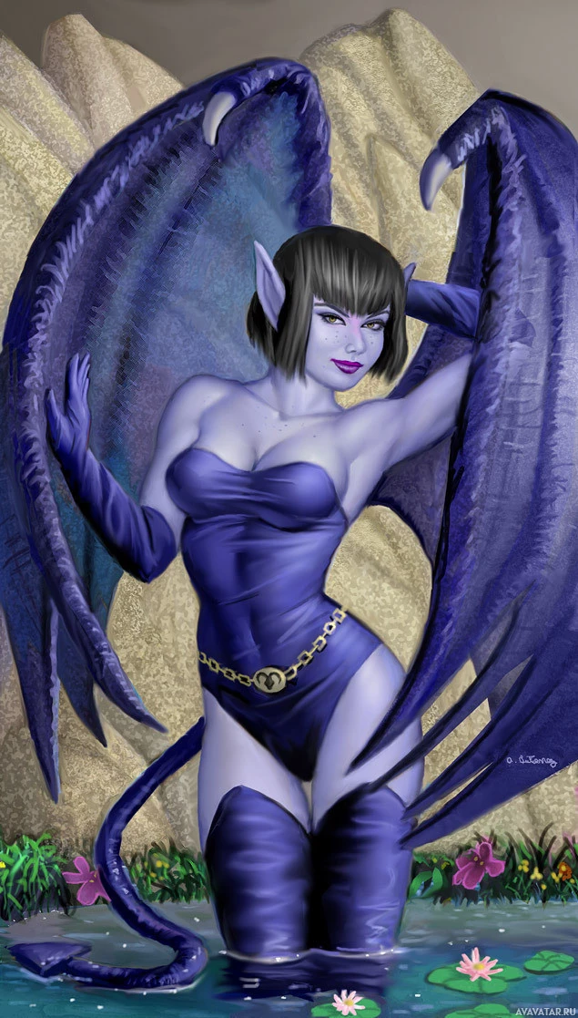 purple skin, horns, and wings, and she is wearing a tight-fitting bodysuit that emphasizes her seductive figure. She is standing in what appears to be a magical or fantasy landscape, possibly near water given