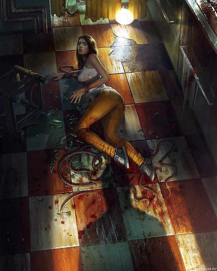signs of blood and destruction around her, suggesting violence or a struggle has occurred. The room is old and worn, with damaged walls and a dirty floor, which adds to