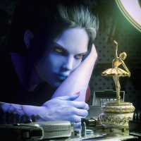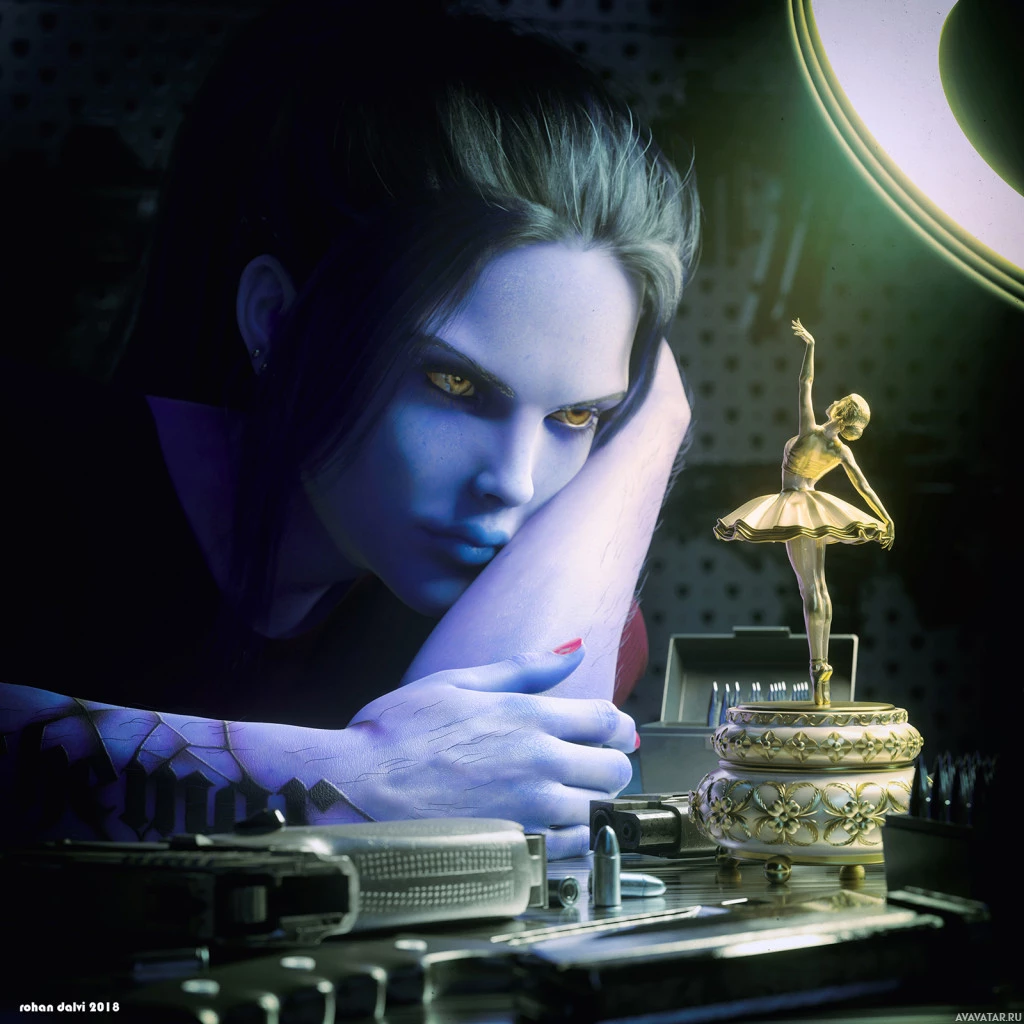 a ballet dancer and a gold trophy on it. There's also what seems to be a gear or weapon lying beside her on the table. The character is wearing