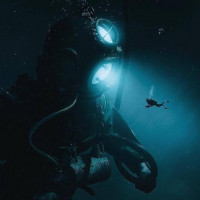 The image shows a person in diving gear, likely an underwater diver, with the surrounding environment indicating depth and darkness, which suggests they are at a significant depth in an ocean or other