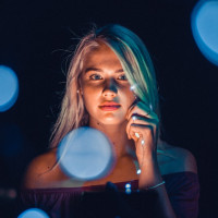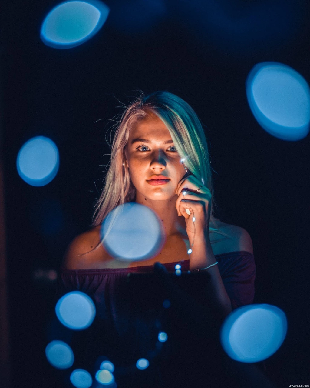 an indoor setting with what looks like blue lights or sparkles surrounding her head. The overall atmosphere of the picture suggests it might have been taken during nighttime or under low
