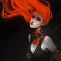 dark tones and accents of red. Her expression is intense or serious, and there are abstract or swirling designs around her that could be interpreted as smoke or a similar effect. The artwork has a high