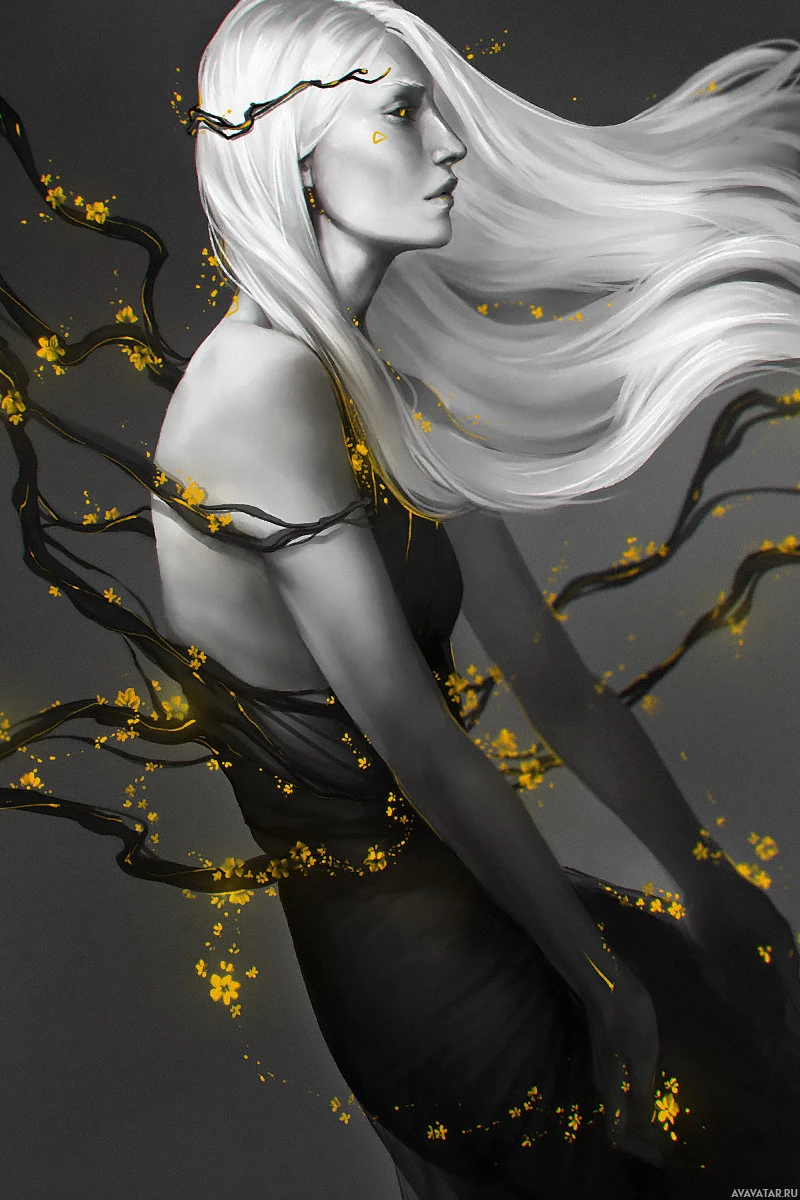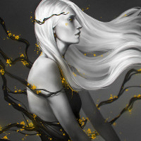 golden flame-like shapes emanating from her back, which gives her an ethereal or magical appearance. The background is quite plain and dark, highlighting the character's presence prominently.