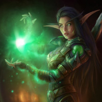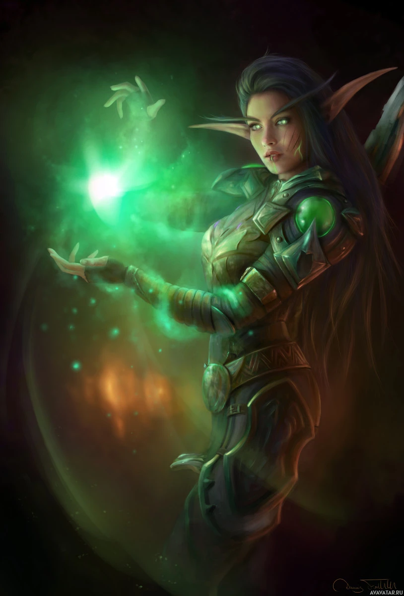 pointed ears, typical of elves in fantasy artwork. She is wearing armor with green elements that suggest a magical or elemental power. In her hand, she holds a staff from which glows a green,