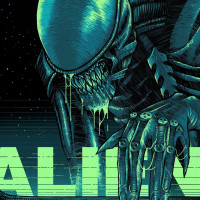 film series. The poster features an illustration of an alien creature with a prominent head and