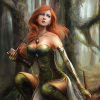 fantasy attire that suggests she could be a character from a story or role-playing game. Her outfit includes a corset and armor, which gives her a warrior or adventurer look. The setting is