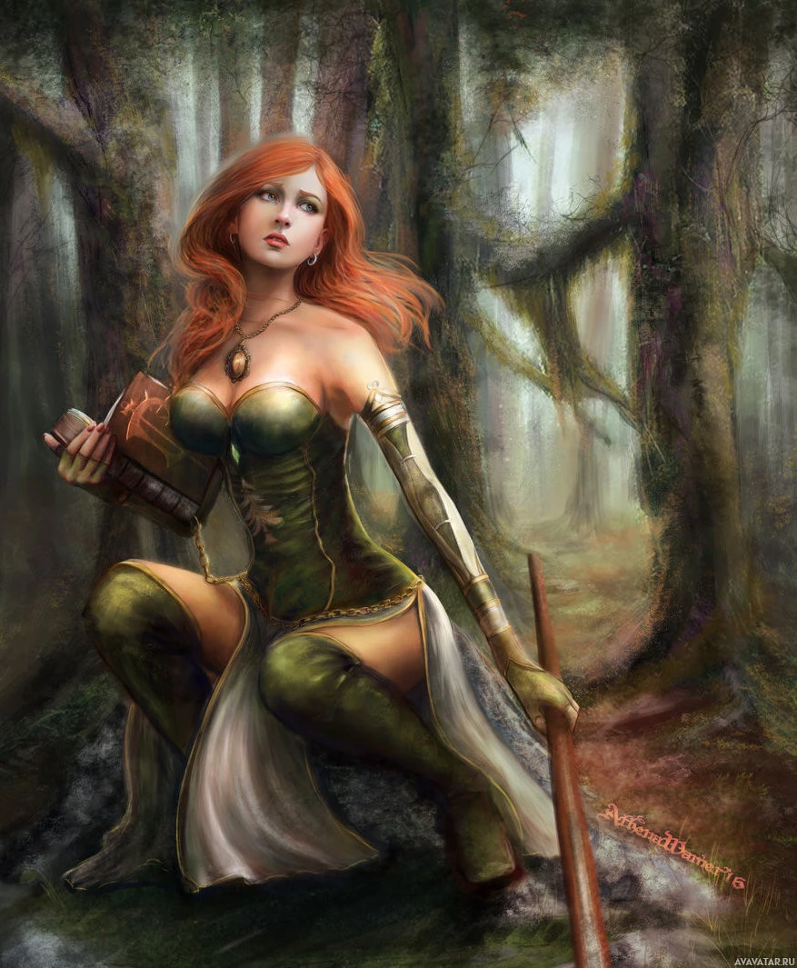an open book in her hands, set in what appears to be a forest. She is dressed in