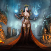 large monsters that resemble dragons, which adds to the mystical or mythical theme of the image. The background appears to be an ancient or magical stone structure, possibly indicating a location of great importance or magical properties within this