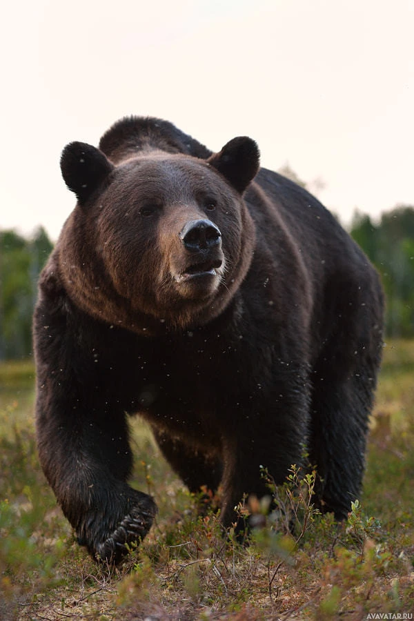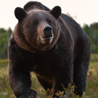 brown bear walking across what appears to be a tundra landscape with sparse vegetation. The bear is in the foreground, and its powerful build is evident, with
