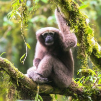 natural habitat, which looks like it could be a rainforest or a similarly lush environment with vegetation. The monkey is climbing up a tree, and there are indications of moss growing on the trees around it, suggesting a humid,