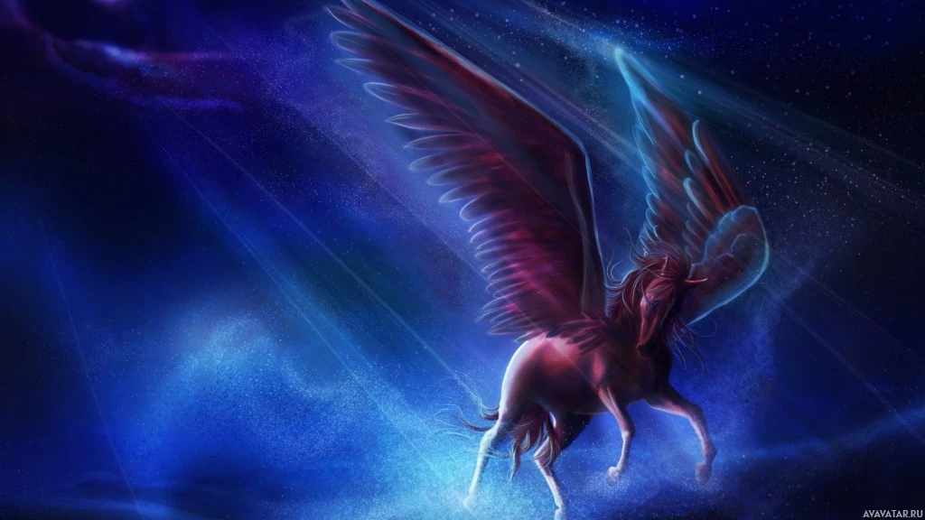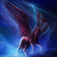 body of a human, wings, and a tail, often represented in artwork and literature as the embodiment of purity and beauty. This particular depiction shows the Pegasus set against a cosmic backdrop that could be interpreted as a starry