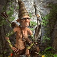 long ears, pointed teeth, and is holding a bow and arrow. He is wearing what looks like