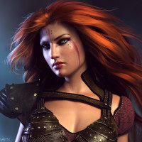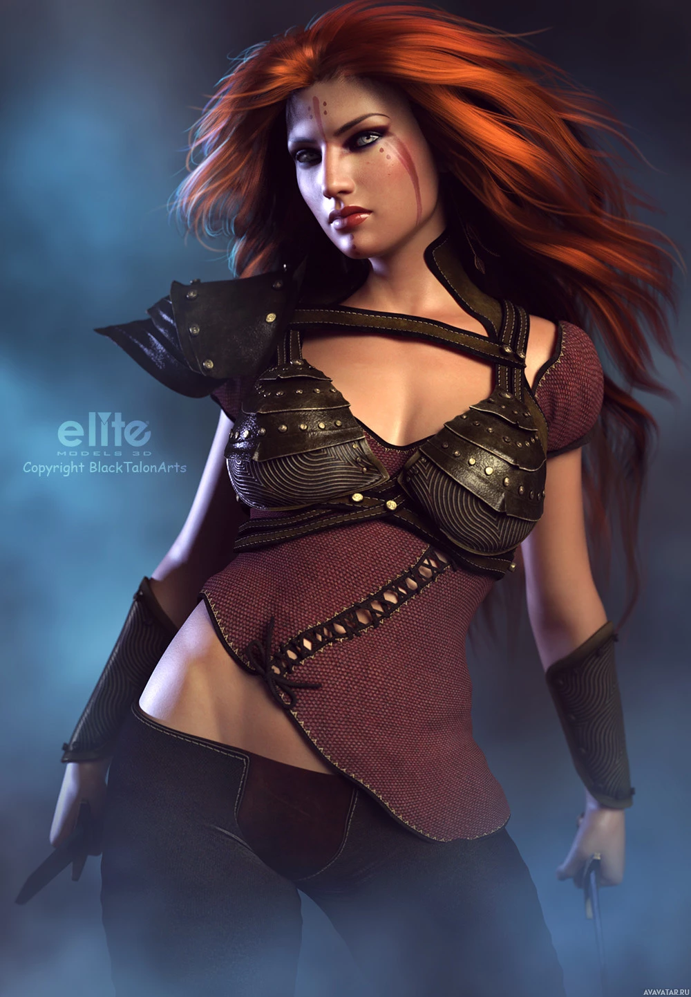 a fantasy setting, as she is wearing armor and holding what looks like a sword or a similar weapon. The background has a dark and moody atmosphere with smoke or mist, which contributes to the overall