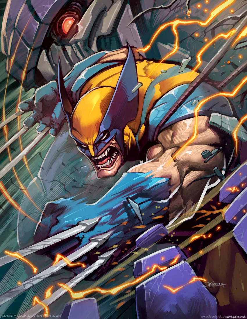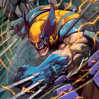 iconic costume and has adamantium claws extended, which are part of his mutant powers that allow him to regenerate at an accelerated rate and possess superhuman senses. The background suggests