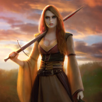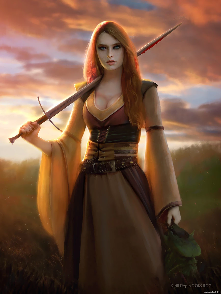 a female character dressed as a medieval or fantasy-style warrior. She is holding a sword in her right hand, which she holds with both hands gripping the hilt. Her attire consists of