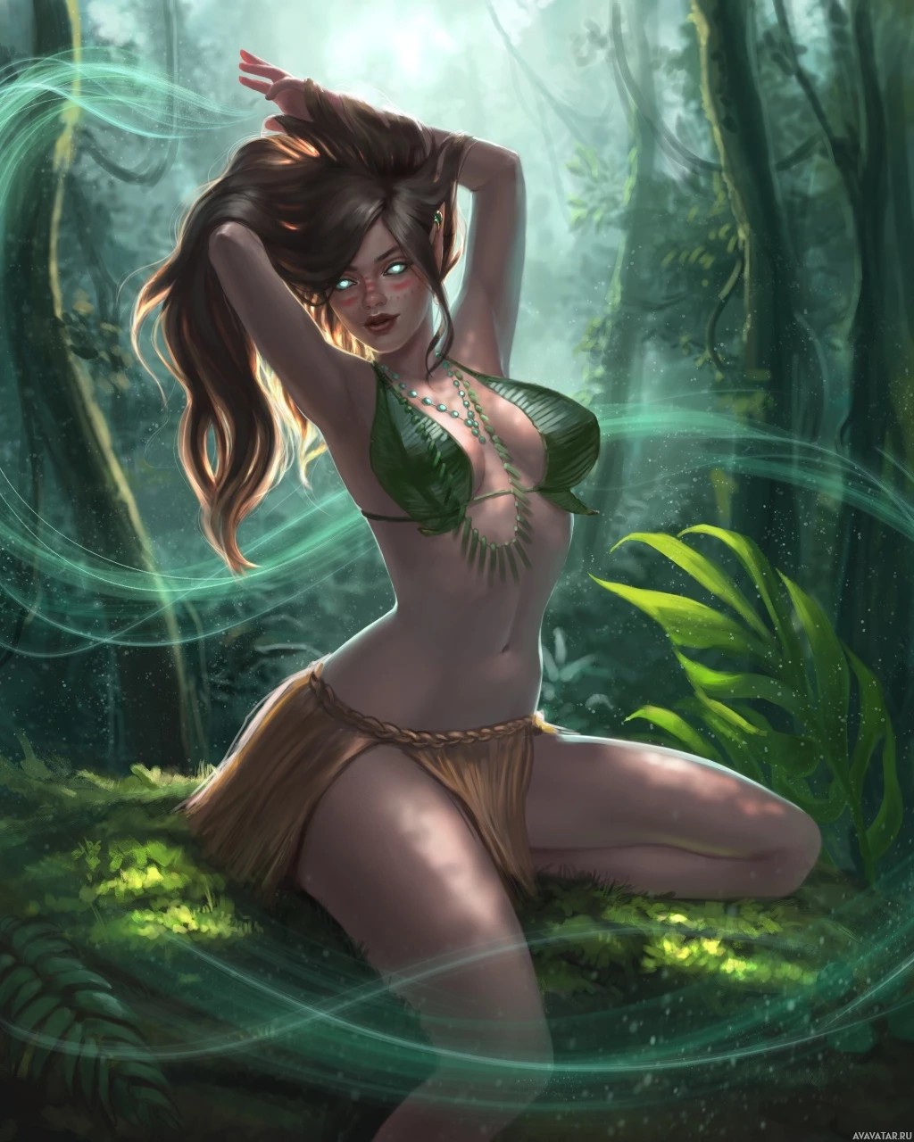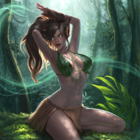 lush greenery and trees around her. The character is wearing a leafy top and has