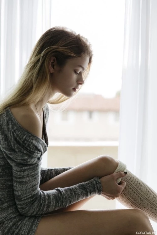 На картинке изображена женщина, сидящая у окна. Она кажется в задумчивой или созерцательной позе, с закрытыми глазами и подбородком на одной руке. Ее поза предполагает, что она может быть глубоко в мыслях или, возможно, испытывать момент самоанализа. Важно не делать предположений о человеке или его эмоциях, основываясь только на этом образе; он захватывает только один момент времени.