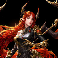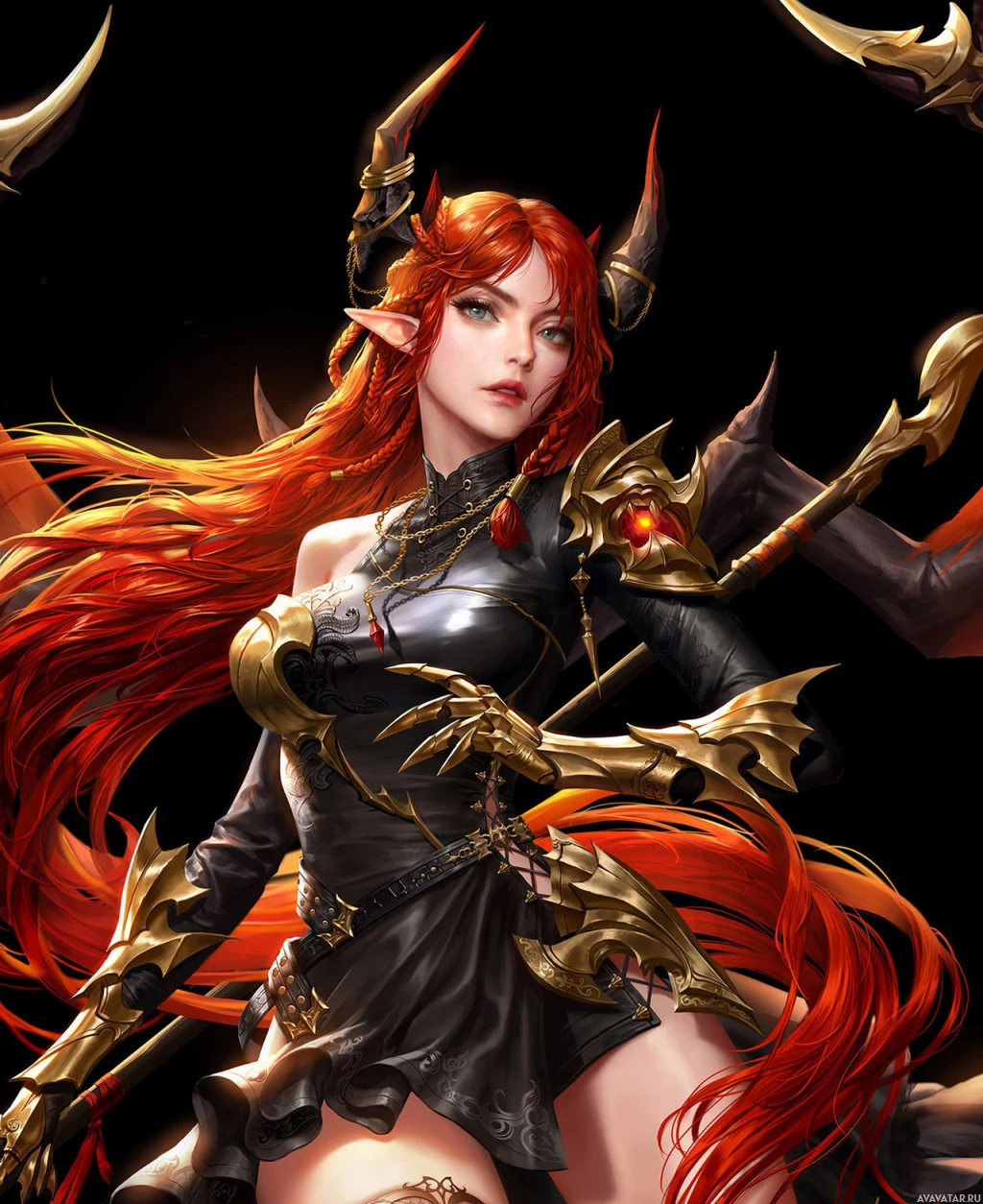 red hair and is adorned with what seems to be armor or protective gear, which includes shoulder guards, arm bracers, and a chest piece. There are also decorative elements on her armor that resemble horns, adding to the fantastical theme. The character is posed in an assertive manner, suggesting she might be a warrior or