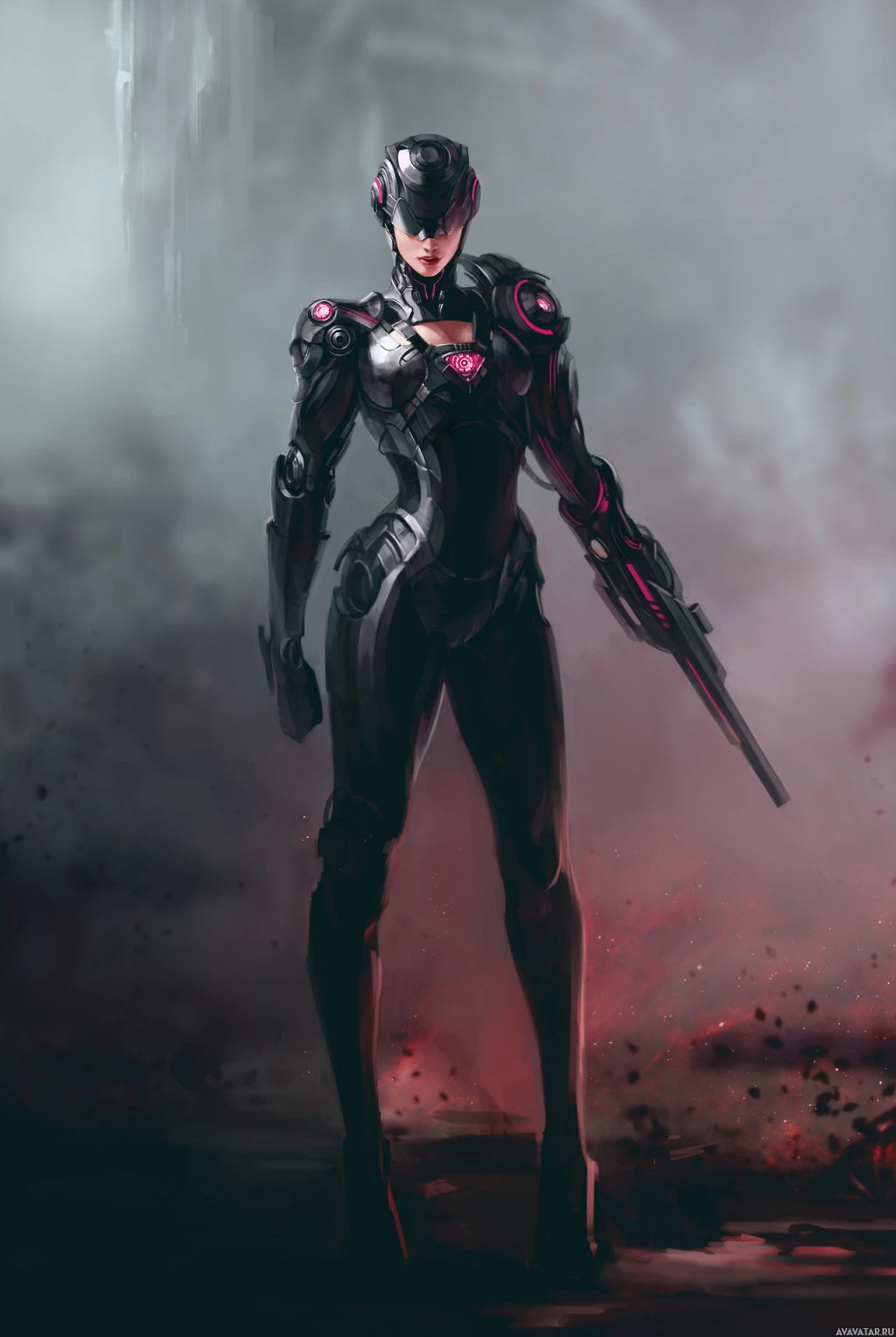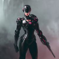 a female figure with a costume that includes a sleek, form-fitting bodysuit with armor elements and a high-tech helmet with a visor that obscures her eyes. Her design suggests she might be a protagonist or an important character in a science fiction narrative or