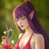 purple hair, wearing what seems to be a dress. She is holding