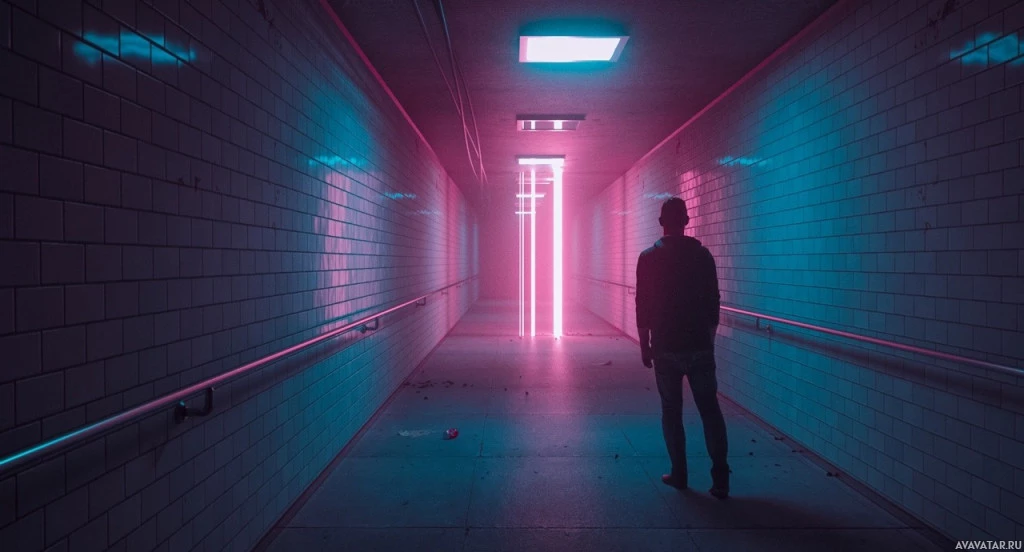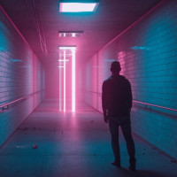 a neon light glowing purple and pink hues. The individual appears as a silhouette due to