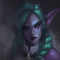 green hair, pointed ears, and is adorned with purple markings or tattoos on their face. They are wearing what looks like armor, suggesting they may be a warrior or guardian