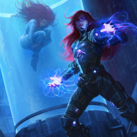advanced technology and machinery around them. The overall tone of the image is dramatic and seems to evoke
