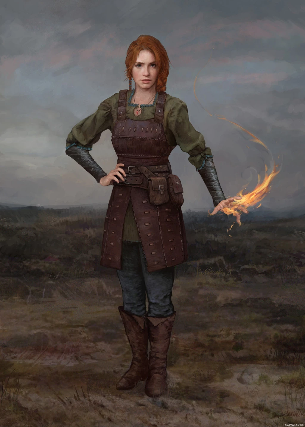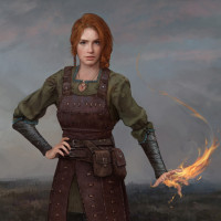 red hair, wearing medieval-style clothing. She is holding what looks like a fire element in her hand, suggesting she might have some sort of magical or mystical ability related to fire. The setting seems to be outdoors during dusk or early evening, given the low light and