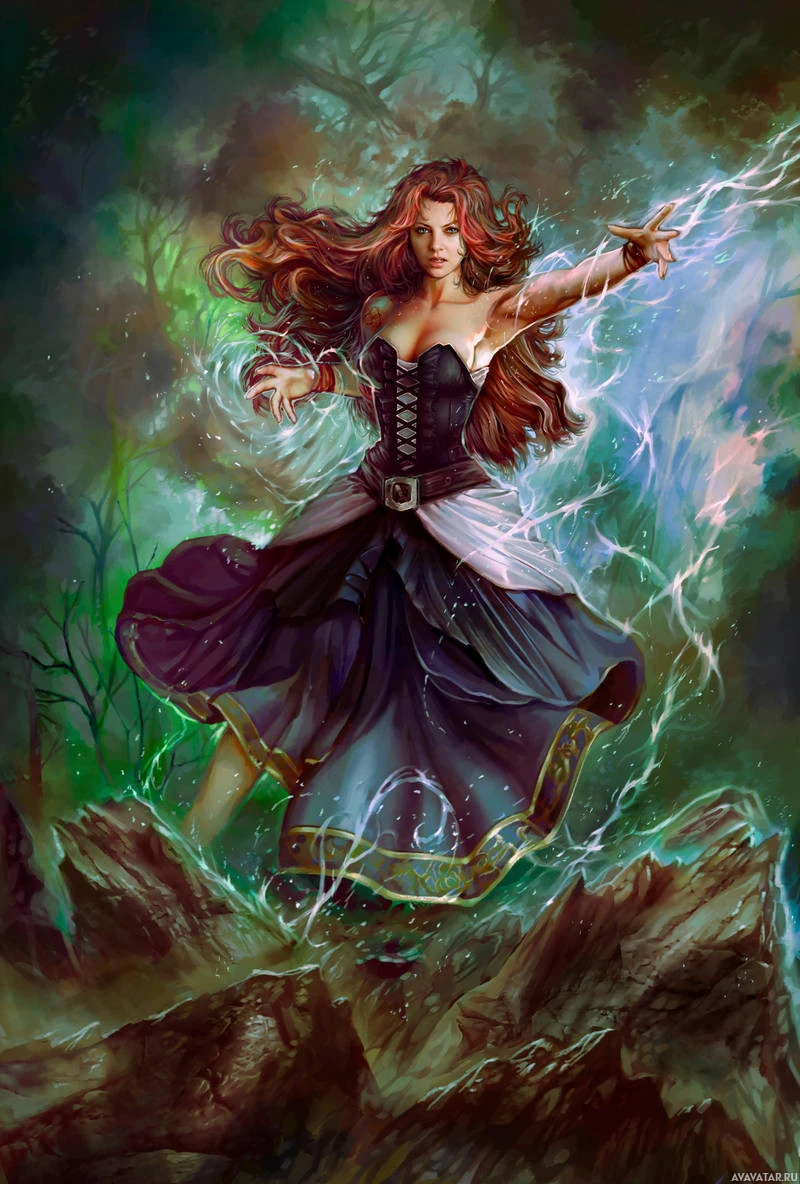 red hair. She is wearing a dress that suggests a medieval or renaissance style, and she appears to be in the middle of casting some