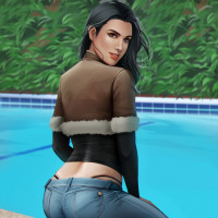 a leather jacket, blue jeans, and high-top sneakers, suggesting a casual, streetwear style. The setting seems to be outdoors near a swimming pool or similar