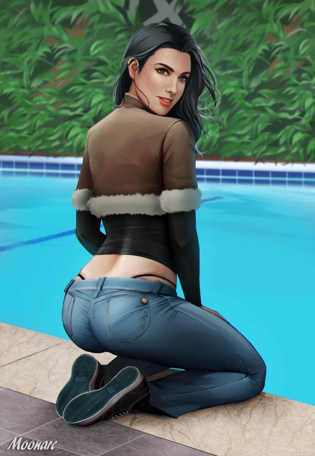 dark hair and is looking over her shoulder with a smirk on her face, giving off an air of confidence or playfulness. She's wearing