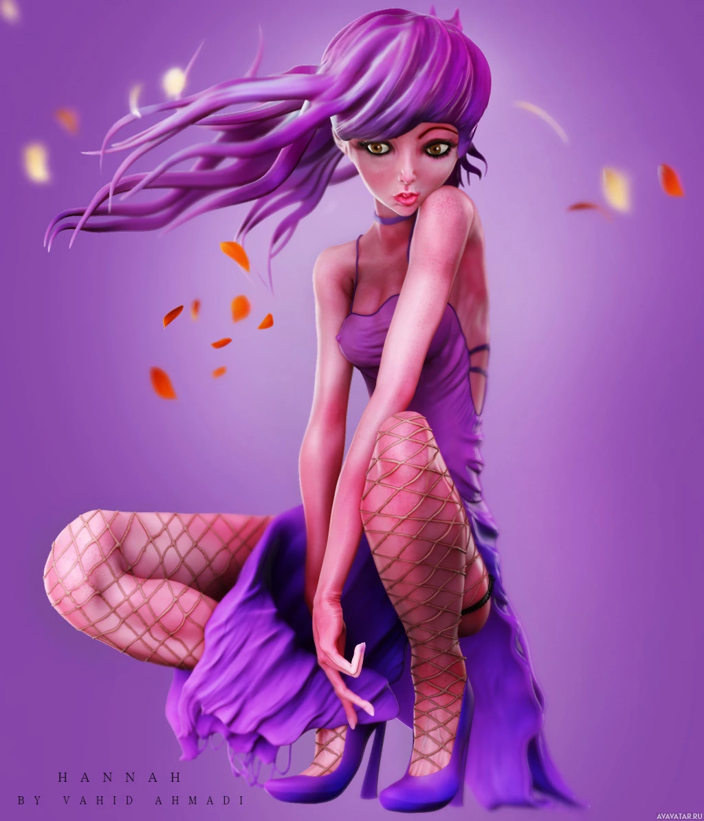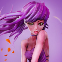 The image shows a digitally created or rendered illustration of a female character. She has purple hair and is wearing a dress that matches her hair color, with additional elements such as fishnet stockings. There are also autumn leaves floating around her, contributing to the artistic composition.