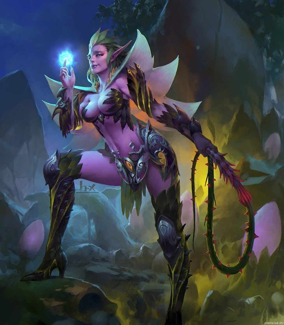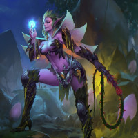 green skin, white eyes, and is wearing armor with various adornments that seem to suggest a dark elven design. In her hand, she holds what looks like a glowing