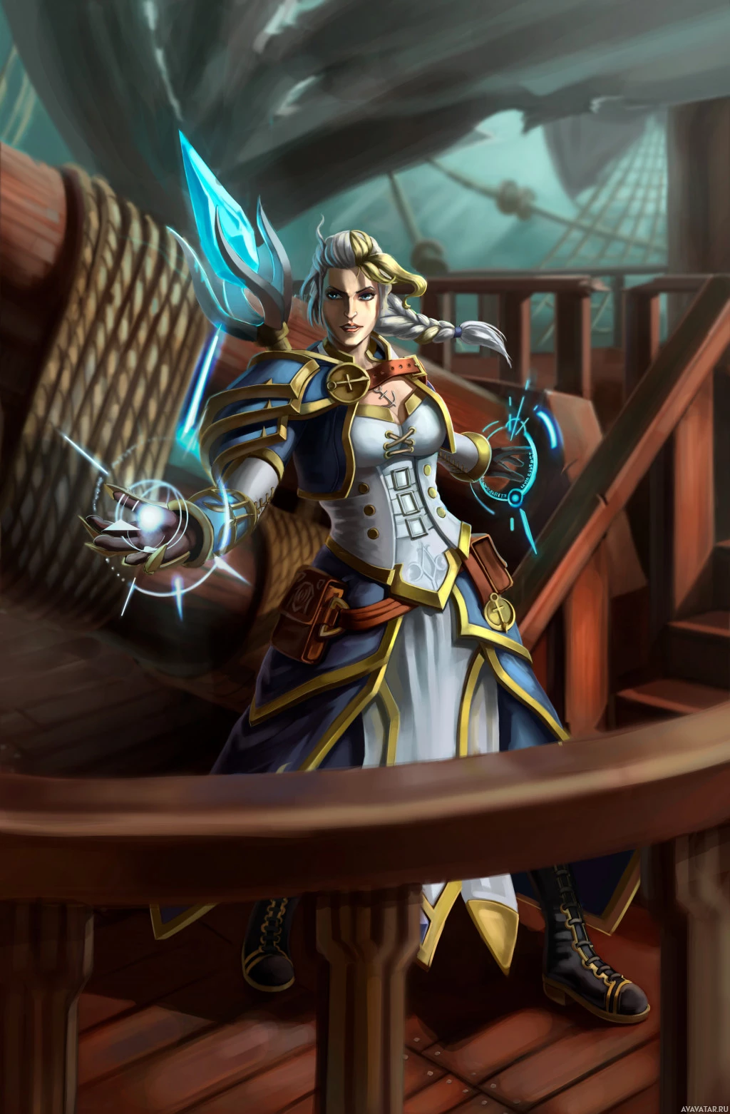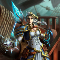 Jaina Proudmoore, known for her role in the Warcraft storyline and as a prominent figure in the game's lore. The art style suggests that this could be from an official "Warcraft" source, such as promotional artwork or