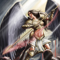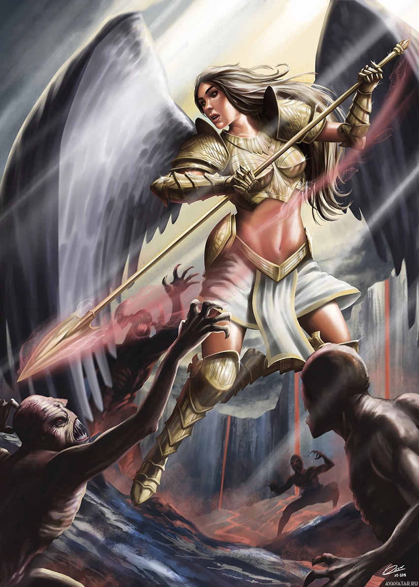 a fantasy character who appears to be an angel. She is depicted with wings, a helmet, and armor, suggesting that she is a warrior or guardian. In her hand, she holds a lance that has been stabbed into the ground, which could imply that she is in combat with other characters, possibly demons or