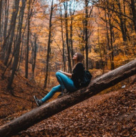 casual attire and seems to be enjoying the natural surroundings, possibly taking a break during their hike or simply spending time in nature. The trees are adorned with vibrant