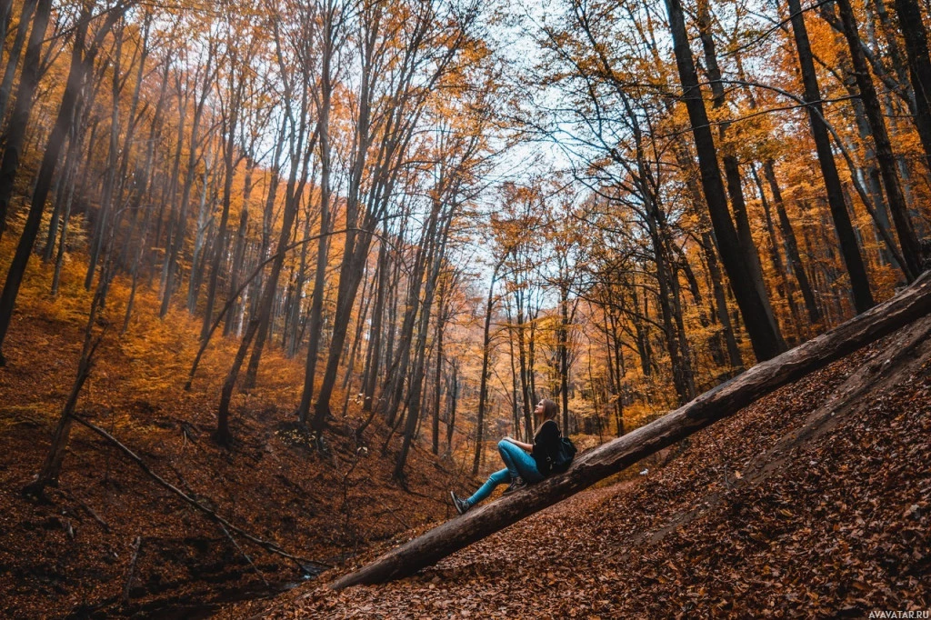The image depicts a person sitting on a fallen tree in what appears to be an autumnal