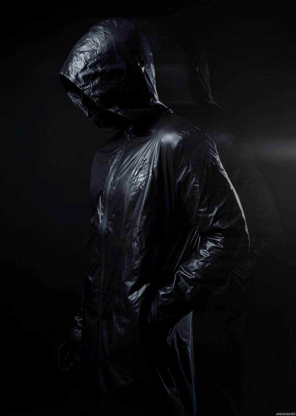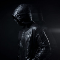 The image features an individual wearing a hooded, raincoat-style