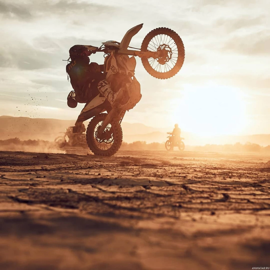 the front wheel lifted off the ground and the back wheel on the ground, suggesting they might be doing a wheelie or a jump of some sort. The background is a sandy environment during what appears to be either sunrise or sunset given