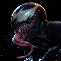 a muscular build, wearing his iconic black and white suit with the Spider-Man logo on it. His mouth is open to reveal