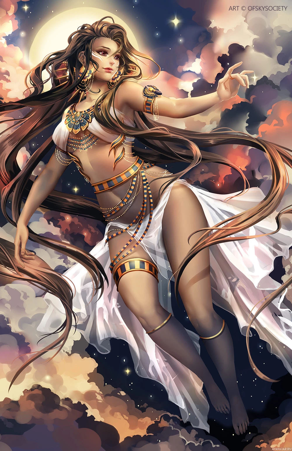 various ornaments and jewelry that suggest a cultural or mythological context. The background of the image depicts a cosmic scene with a crescent moon in the sky, clouds, stars, and possibly a nebula or galaxy, which contributes to