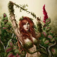 Poison Ivy, who is a fictional supervillainess in the DC Comics universe. She is known for her plant-like features and powers that revolve around plants. In this particular artwork, she is portrayed with
