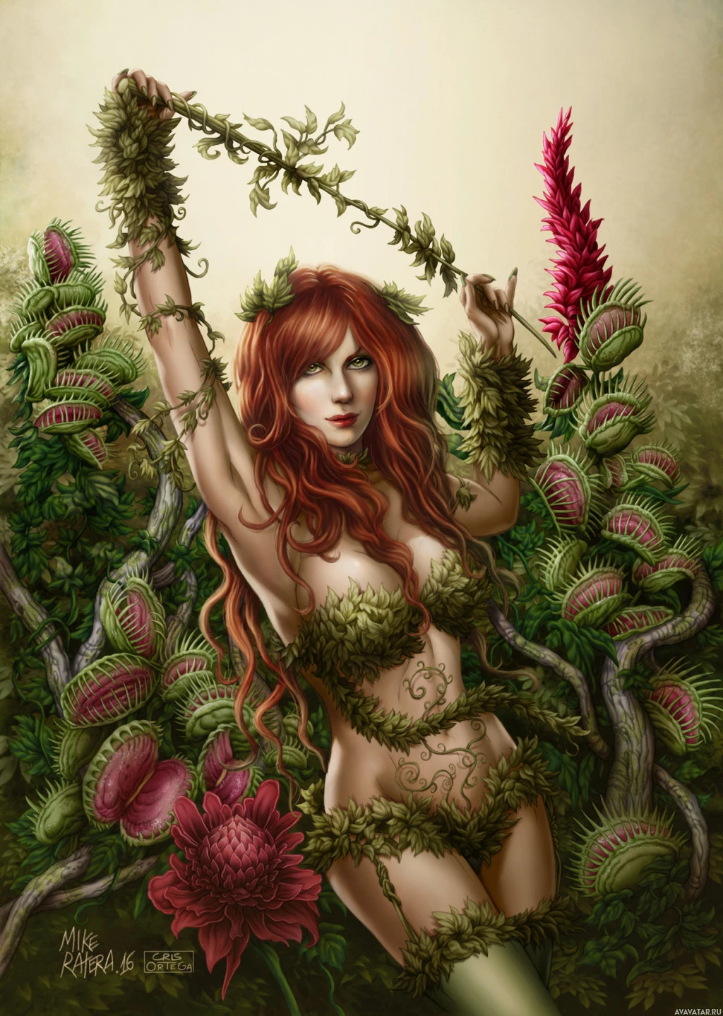 red hair and green skin, wearing a costume made out of leaves, and surrounded by lush foliage, which is consistent with her iconic appearance in the comics. The artist has signed the painting at the bottom right corner.