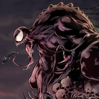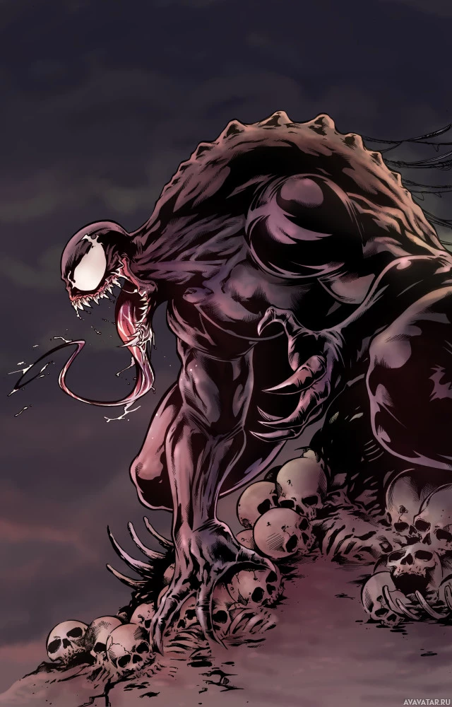 sharp teeth, and a sinister expression as he stands among a pile of skulls, suggesting a scene of danger or conflict.