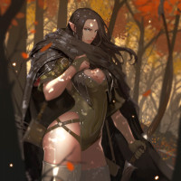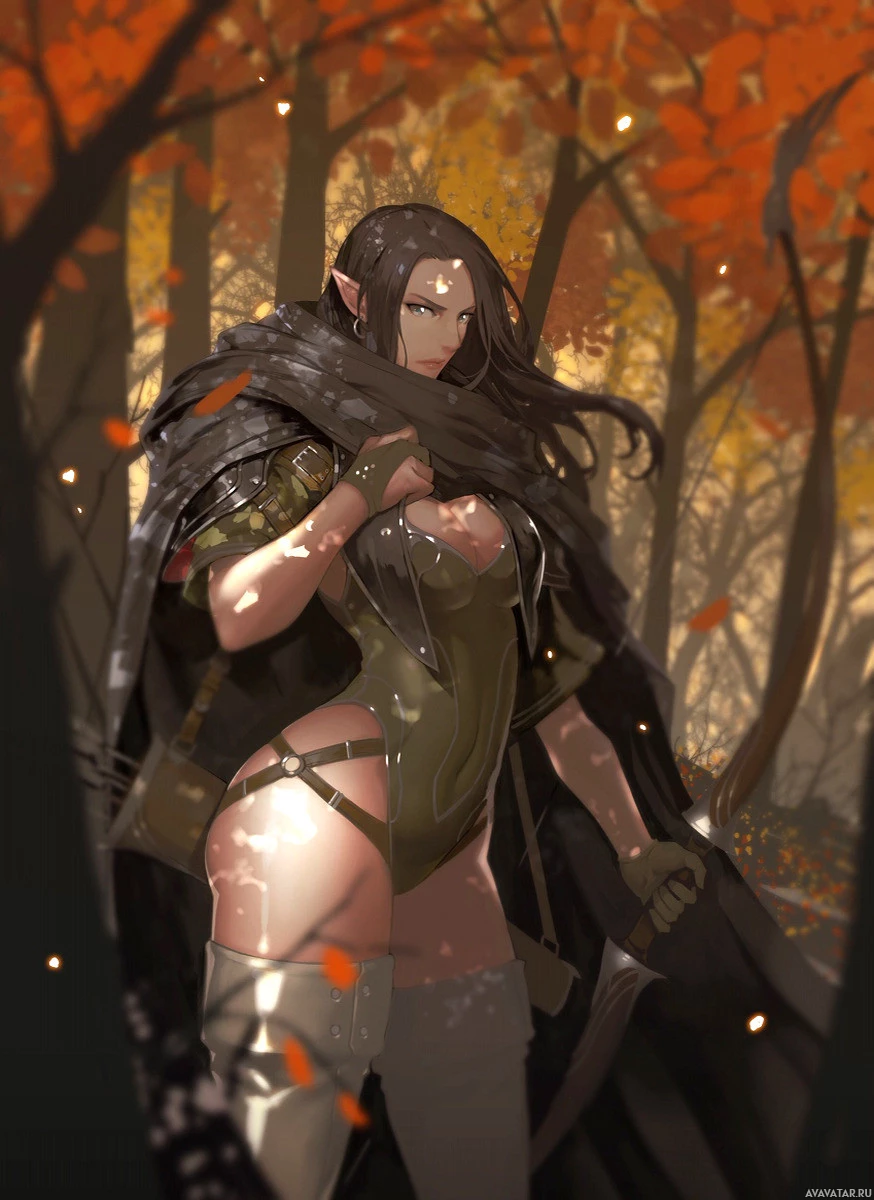 fantasy literature or media, styled as an elf. The character is shown standing in a forest setting with autumnal