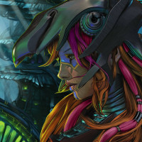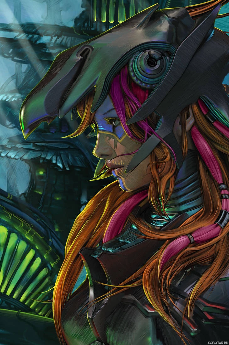 red hair and is wearing some sort of armor or costume with intricate designs. There are futuristic elements such as