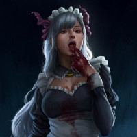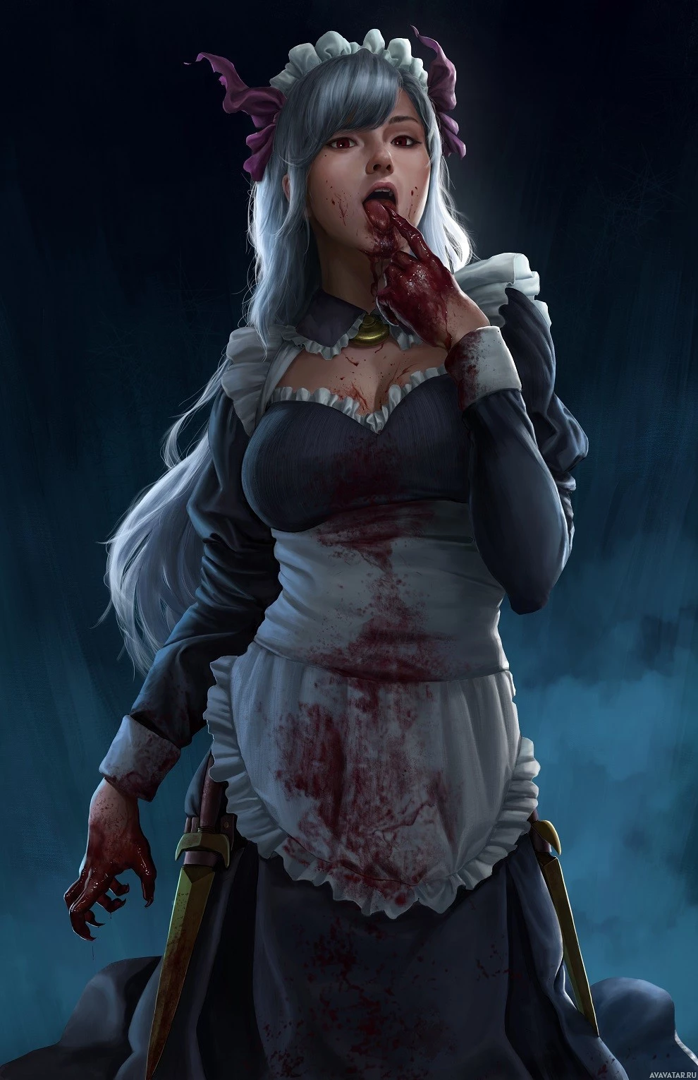 Final Fantasy" series. This character is wearing a maid's uniform with what looks like blood splattered on it, and she has