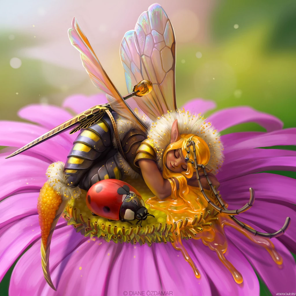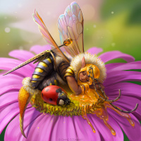 the body of a human, but with the wings and antennae typical of a bee. It is depicted in a fantasy-like setting, resting on